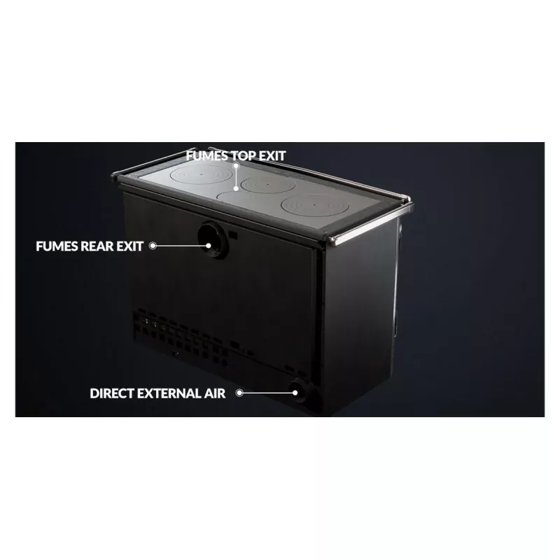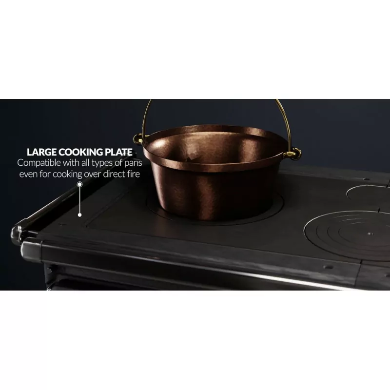 L’Alaska se distingue par sa grande plaque de cuisson (~100 cm), idéale pour préparer plusieurs plats simultanément. Son grand four émaillé de 78 litres, doté d’une soupape anti-vapeur et de rails amovibles, permet d’atteindre facilement plus de 300°C. Le foyer permet d’accueillir des bûche de 50cm.