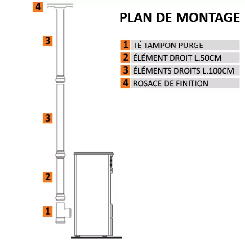 L’installation de ce pack est un vrai jeu d’enfant. Les tuyaux s’emboite facilement les uns dans les autres et vous permet de raccorder votre poêle en quelques minutes seulement. Il vous suffira donc d’emboiter les éléments dans le même ordre que sur ce schéma.