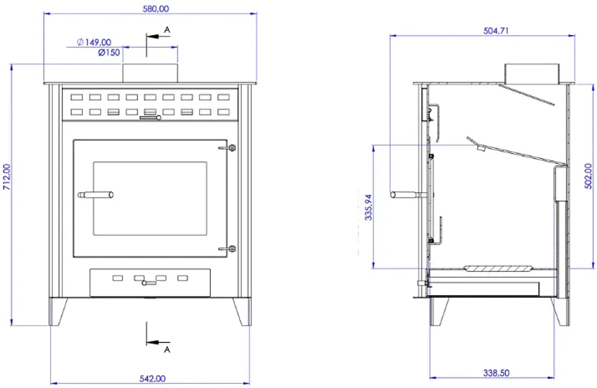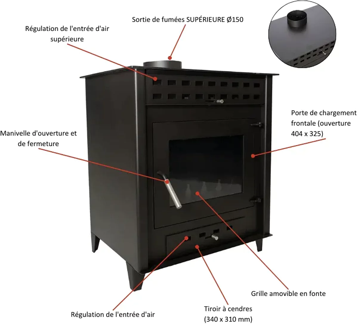 - Sortie de fumées supérieure (Ø150 mm) : Installation flexible et discrète.