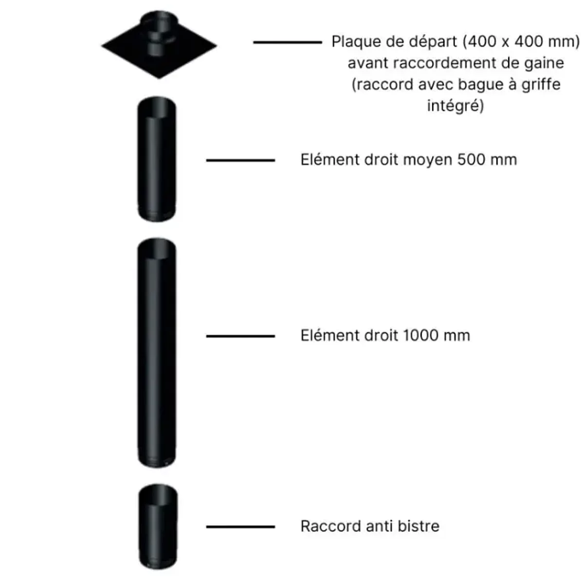 - Élément droit ajustable intégré au kit, évitant la découpe du conduit pour s’adapter à votre installation.