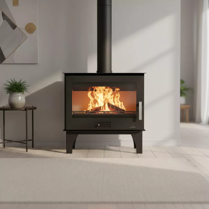 Le diamètre de sortie de fumée de 150 mm s’intègre facilement aux conduits standards, tandis que les dimensions généreuses de la chambre de combustion (585 x 250 x 304 mm) facilitent le chargement de grandes bûches.