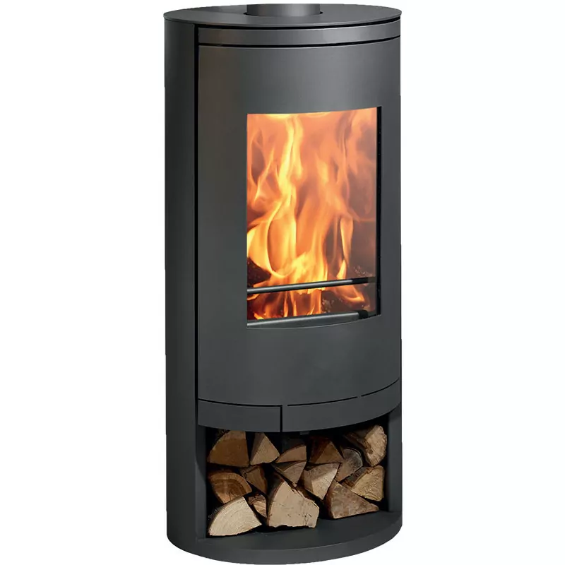 Un range-bûches intégré ajoute un aspect pratique, permettant de ranger le bois à proximité pour une gestion simplifiée.