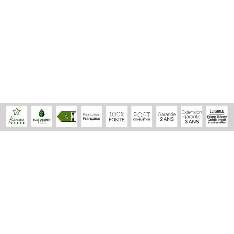 - Normes et labels : EN 13240, flammes vertes 7 étoiles, Eco Design 2022, Ecolabel A