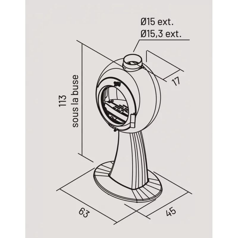 H 113 x L 63 x P 45 cm Puissance 7 kW. Volume corrigé chauffé 80 à 220 m3. Régulation manuelle. Poids 100 kg. Combustibles: bûches de 45 cm. Chargement avant. Départ des fumées dessus uniquement. Buse de départ de 0 150 mm ext, 153 mm ext. Distance du sol au-dessus de la buse de départ arrière 113 cm. Habillage fonte