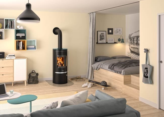 Un poêle à bois de forme ronde d’une puissance de 6 kw avec corps acier, dessus verre et bûcher fermé. L’ouverture et la fermeture de type Snap Lock permet une conduite facile du feu, Le poêle est raccordable en air primaire avec l’option buse de raccordement
