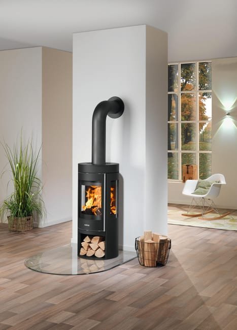Pôele à bois rond de faible encombrement (Ø 46cm) et petite puissance 5,5KW, avec une vision de la flamme à 180° grace à ses 3 vitres galbées