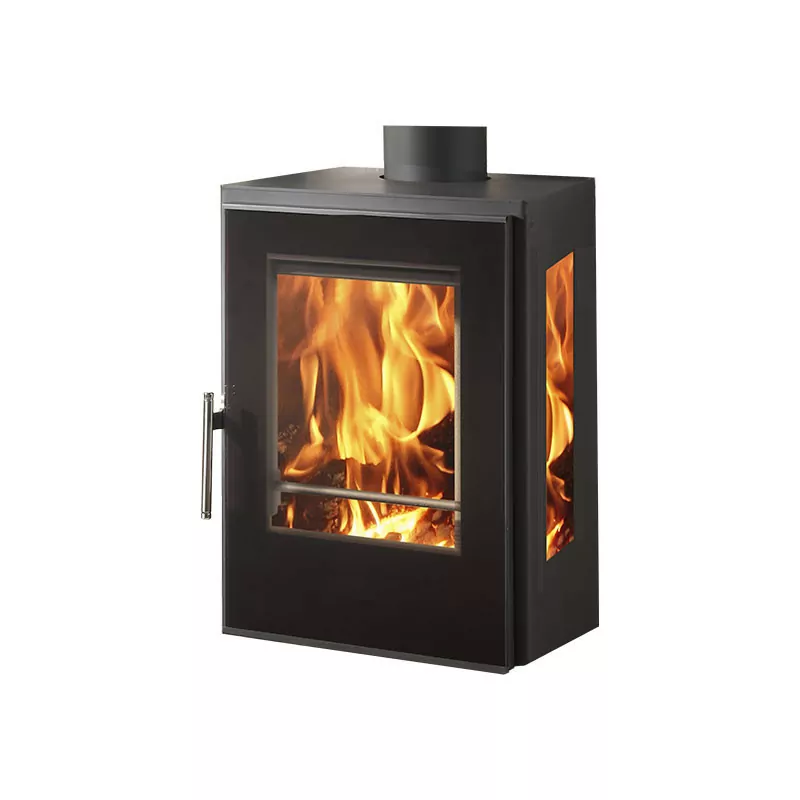 Profitez d’un spectacle inégalé avec ses trois grandes vitres sérigraphiées qui offrent une vision étendue sur les flammes. Grâce à son système vitre propre, les dépôts de suie sont limités, garantissant une clarté prolongée. Le pare-bûches intégré sécurise le foyer en empêchant les bûches de rouler.