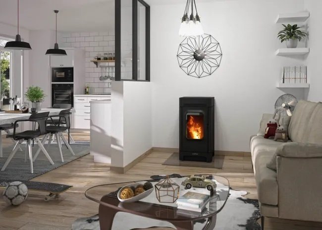 Poêle à Granulés Acier Noir en convection naturelle de 6 kw (réservoir de 25kgs) vous offrant autonomie et silence de fonctionnement sans oublier la WIFI de série