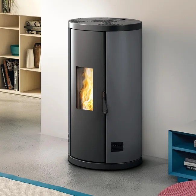 Poêle étanche ronde. Porte avec dispositif exclusif «d’adaptation dynamique», échangeurs de chaleur très performants, grand tiroir à cendres, Poignée « main froide ».