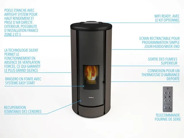 Poêle étanche AIRTIGHT SYSTEM avec 9,1 kW de puissance, sortie des fumées superieure concentrique (PGI) qui permet de raccorder l’air comburant directement de l’exterieur au concentrique pour le maximum de confort. Le haut rendement permet de faire des économies. Grâce à l’étanchéité du AIRTIGHT SYSTEM, l’installation peut être faite, dans certaines conditions (zone 2 et zone 3), sans grilles de ventilation que amènent d’air froid dans le logement et donc de améliorer le confort thermique. Possilité de passer en SILENT SYSTEM mode silence en puissance reduite . Programmation jour/hebdo WI-FI FreePoint integré – pilotage en distance possible à traver la App Freepoint. Possibilité de connexion à un thermostat déporté. Porte ronde en verre avec serigraphie pour mieux profiter le vision de la flamme.
