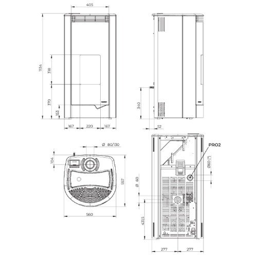 - Prévu pour la sortie des fumées et la reprise de l’air sur le dessus moyennant un tube coaxial intégré dans la géométrie du poêle