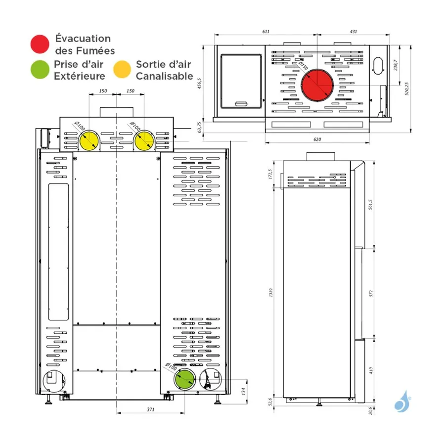 2 sorties d’air chaud canalisables Ø100 mm